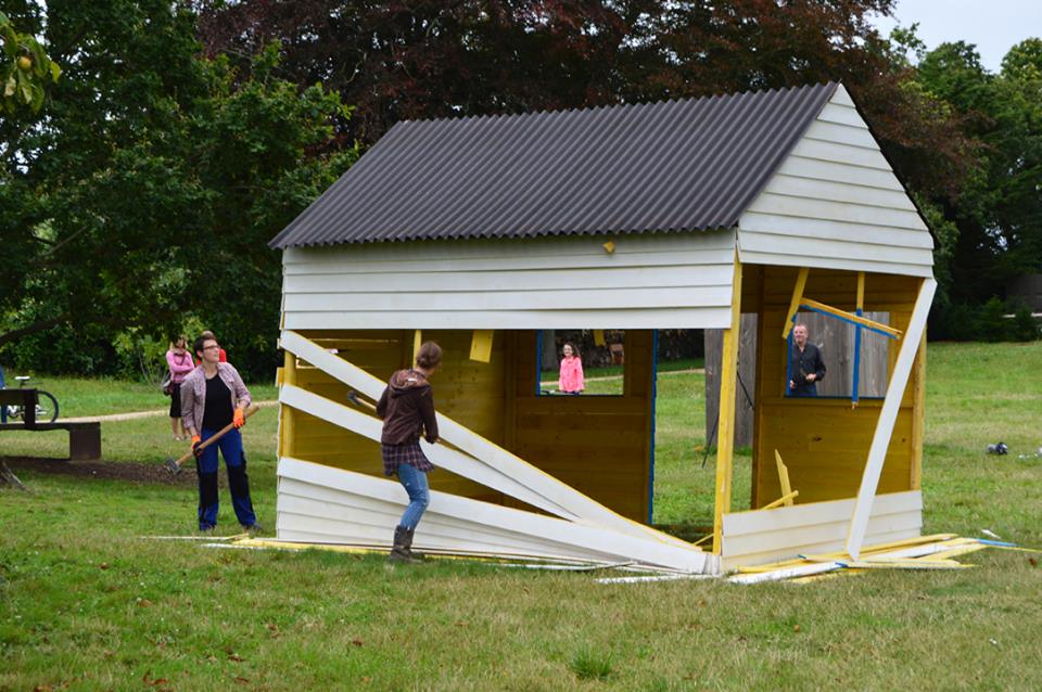 Pour clore sa résidence, elle a choisi de ré-activer la performance « Si j’étais démolisseur », qu’elle réalise depuis 2010, dans différents contextes. Depuis plusieurs années, elle développe en effet un projet de construction/destruction d’un petit habitat, dans différents contextes lieux, selon un protocole qui s’enrichit au fil des expériences. A chaque intervention, l’artiste construit elle-même une cabane à base de voliges et chevrons, qu’elle détruit chaque jour à la masse durant l’exposition et qu’elle reconstruit inlassablement à partir des éléments restants. A travers un va-et-vient continuel entre bricolage et sculpture, l’artiste explore ainsi des notions liées à l’architecture et à l’habitation, aux situations parfois précaires et aux lieux « habités ».